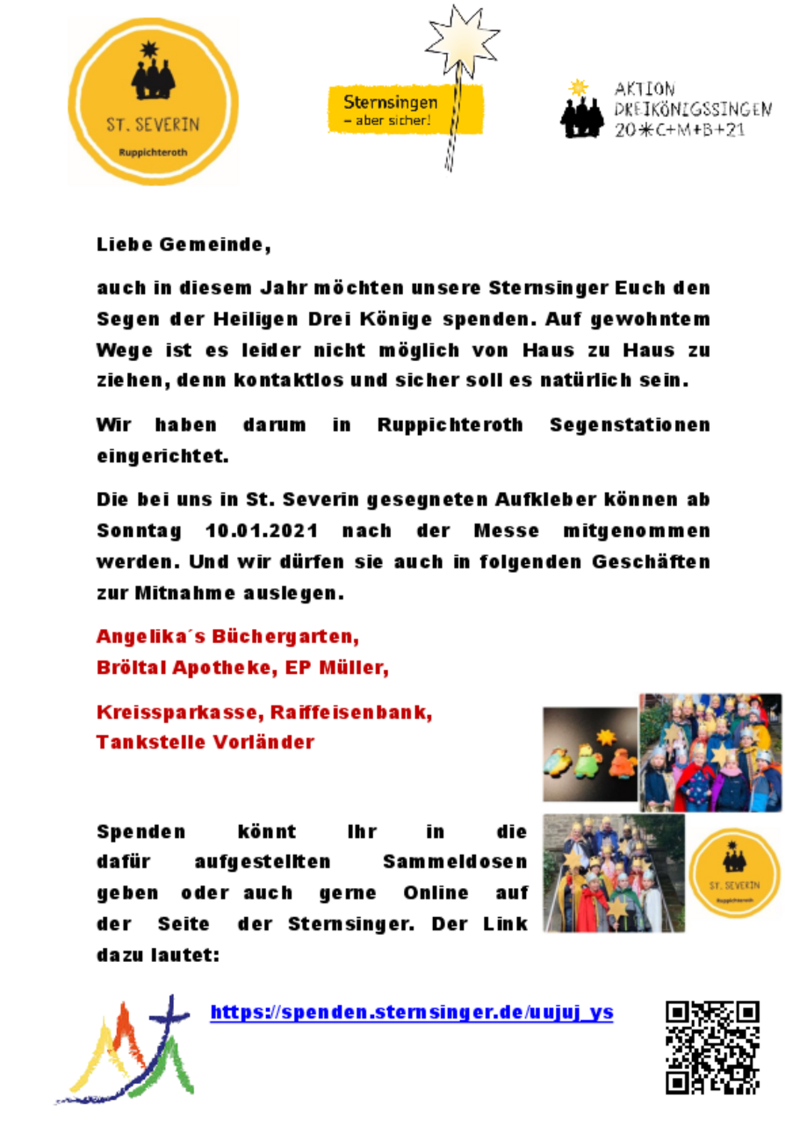 In Ruppichteroth wurden in der Heiligen Messe am Dienstagabend (05.01.) die Segensaufkleber und Kreide (für mögliche spätere Einsätze) von Pfarrer Heinzen gesegnet. Die Aufkleber und die dazugehörigen Spendendosen stehen hinten in der Kirche und können dort genutzt werden, um den Segen mit nach Hause zu nehmen und eine Spende zu hinterlassen. Aber nicht nur in der Kirche besteht die Möglichkeit, die Segensaufkleber zu erhalten. Viele Geschäfte in Ruppichteroth haben sich bereiterklärt, eine "Segensstation" in ihrem Laden oder ihrer Verkaufsstelle aufzustellen und damit die Ruppichterother Sternsinger zu unterstützen. Aktuell sind folgende Geschäfte beteiligt: Angelikas Büchergarten, Tankstelle Vorländer, Bröltal Apotheke, EP Müller mit Postfiliale, VR Bank und Kreissparkasse (siehe auch die Bilderstrecke auf der rechten Seite). Darüber hinaus gibt es einen Link zur Sternsinger-Website, auf der man auch online spenden kann. Zu der Website gelangt man ebenfalls über einen QR-Code (siehe Plakat auf der rechten Seite der STARTSEITE der Homepage).